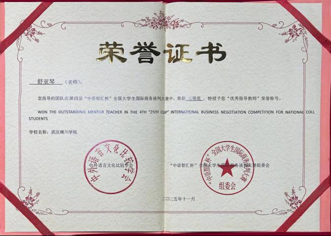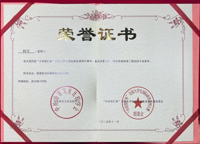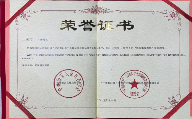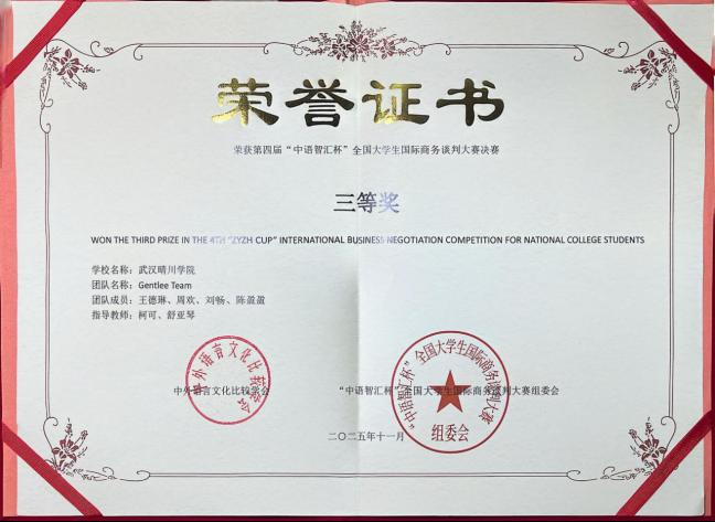 近日,在第四届“中语智汇杯”全国大学生国际商务谈判大赛全国总决赛中,外国语学院柯可、舒亚琴两位教师指导的队伍(团队成员:王德琳、周欢、刘畅、陈盈盈)与来自全国高校的143支晋级队伍展开激烈角逐,最终凭借稳定的表现荣获全国三等奖。同时,柯可、舒亚琴老师获评“优秀指导教师”,柯可老师还应邀担任了全国决赛评委。