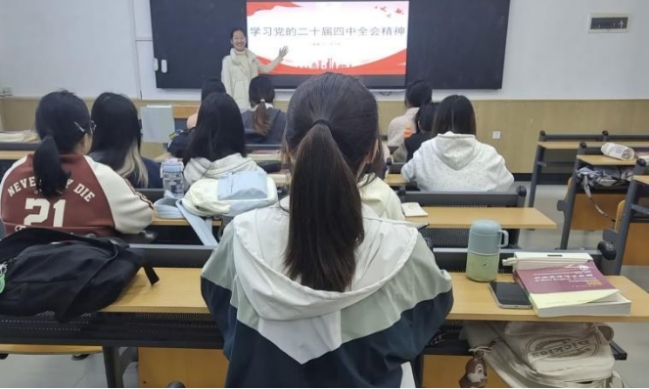 团支书贾茜然首先为同学们梳理了党的二十届四中全会召开背景、核心要义与重大意义,用通俗语言解读新思想新部署,随后播放全会精神解读专题短片。