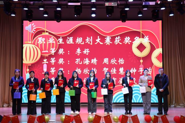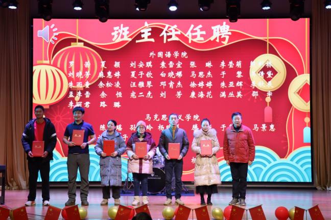 在颁奖和发放聘书环节,副校长张克华同志为外国语学院2025年新聘班主任代表颁发聘书。外国语学院院长周保国教授为“两弹一星”精神宣讲和第二届职业规划大赛获奖选手颁发证书和奖品。外国语学院党总支书记刘泽政老师为院徽设计一等奖选手颁发证书和奖品。外国语学院副院长张秀芳教授为学院国防演讲比赛和孝德文化演讲比赛获奖选手颁发证书和奖品。