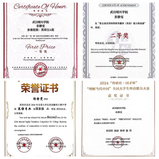 她以竞赛为梯,锤炼创新本领在大一和大二期间,她在国家级赛事中连续取得突破:斩获“全国高校商业精英挑战赛”全国总决赛一等奖、“全国大学生英语翻译大赛”国家二等奖、“全国大学生英语写作大赛”国家二等奖等多项大奖。