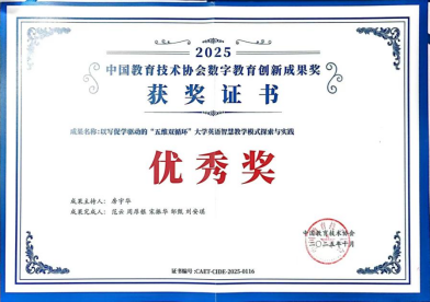 近日,武汉晴川学院外国语学院大学英语教研室房宇华、范云、周厚银、宋振华、邹甄、刘安琪联合申报的《以写促学驱动的“五维双循环”大学英语智慧教学模式探索与实践》教学成果在中国教育技术协会组织的首届“数字教育创新成果奖”评选中荣获优秀奖。