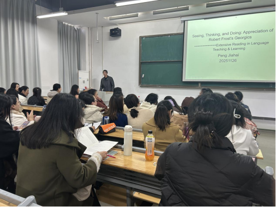 为拓宽外语专业教师的人文视野与教学创新能力,11月26日下午,外国语学院特邀彭家海教授在教一105教室讲授了一堂题为“看—想—干:弗罗斯特农事诗欣赏”的学术讲座。外国语学院英语系、商务英语系、翻译系和大学英语教研室全体教师参加。