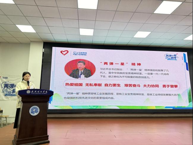 活动在施禾羽子老师带来“两弹一星”精神专题宣讲中拉开序幕。她以“精神不灭,薪火相传”为核心,从“两弹一星”工程的历史背景、研制历程到精神内核,进行了系统而生动的解读。她通过珍贵的历史资料、感人的先辈事迹,还原了郭永怀、邓稼先等元勋们隐姓埋名、扎根戈壁的奋斗场景:“在缺衣少食、设备简陋的极端条件下,科研先辈们用算盘演算数据,用双手搭建试验台,用生命捍卫国家机密,正是这份‘干惊天动地事,做隐姓埋名人’的坚守,让中国打破了超级大国的核垄断与技术封锁。”施老师鼓励青年学子将个人理想融入国家发展大局,在学习科研、社会实践中践行“勇于登攀、大力协同”的精神,现场掌声此起彼伏。