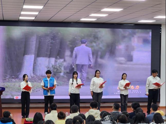 最后,由学生党支部童瑶、刘润澜、王春华和遗韵相承志愿服务队的徐求灵、刘叶葳、李宇轩六位同学带来情景式朗诵《星辰为证,初心如磐》。他们以郭永怀、邓稼先、钱三强三位元勋的事迹为蓝本,通过深情的旁白、生动的对话与沉浸式的演绎,还原了先辈们以身许国、攻坚克难的感人瞬间。从郭永怀以身护研的决绝,到邓稼先扎根戈壁的坚守,再到钱三强引领团队的担当,一幕幕场景催人泪下,让在场师生仿佛穿越时空,直面先辈们的家国情怀与赤子之心,将活动氛围推向高潮。