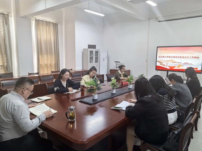 4月20日下午,外国语学院党总支在综二413会议室召开4月份工作例会。会议由学院党总支书记刘泽政主持,全体党总支委员、各党支部书记参加会议,各系(部)主要负责人列席会议。会议主要传达了省委教育工委举办的2026年全省高校院(系)党组织书记培训班学习精神,部署近期党建工作重点任务,统筹协调各系(部)相关业务工作。